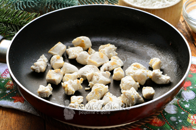 Сковороду слегка смажьте растительным маслом, выложите туда кусочки куриного мяса, обжаривайте их на среднем огне 5-6 минут. Посолите и поперчите по вкусу.