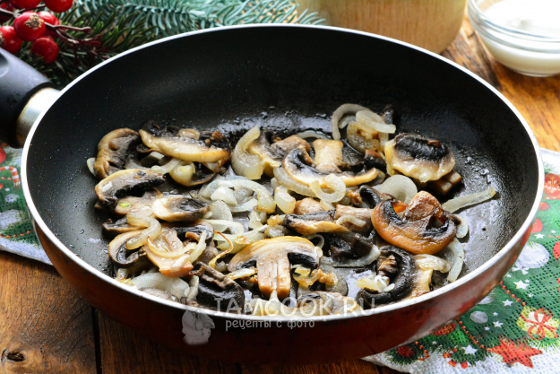Сверху распределите обжаренные грибы с луком.