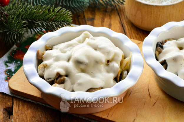 Все ингредиенты полейте сметанным соусом.