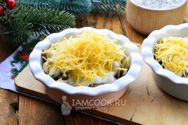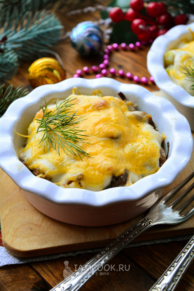 В завершение присыпьте жульен натертым сыром и отправьте в духовку.