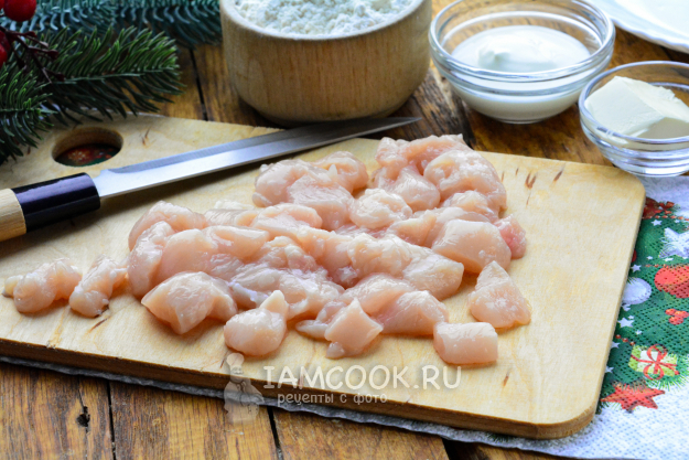 Куриное филе сполосните и нарежьте небольшими кусочками.