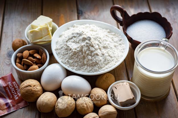 Соберите все ингредиенты для дрожжевых булочек с орехами и корицей. Молоко в сотейнике нагрейте на маленьком огне до температуры примерно в 35 градусов.