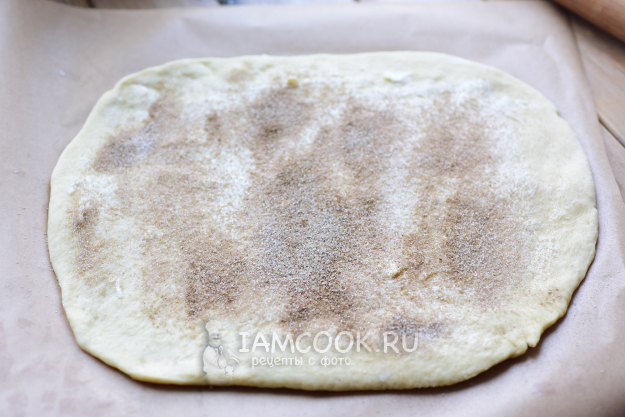Затем в мисочке смешайте сахар и корицу, перемешайте и присыпьте поверх масляного слоя.