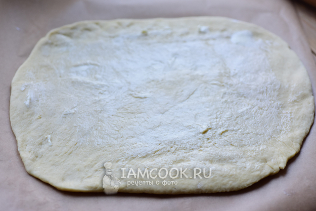 Все тесто разделите на две равные части. Припылите рабочую поверхность мукой и одну часть теста раскатайте скалкой в прямоугольный пласт толщиной примерно в 4-5 мм. Мягким сливочным маслом смажьте всю поверхность теста.
