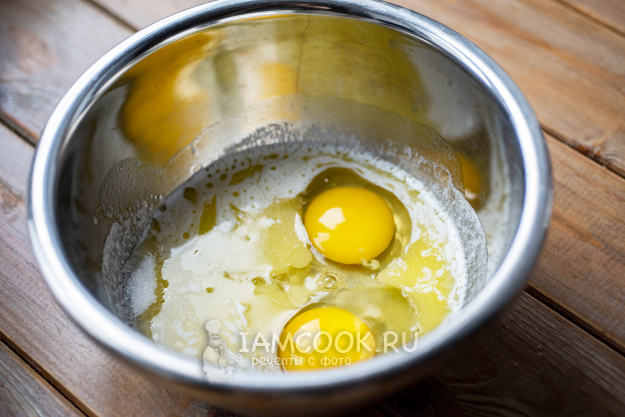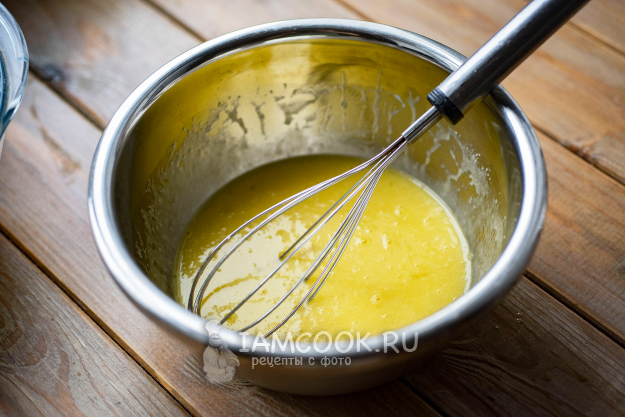 В отдельную миску залейте сливочное масло, предварительно растопленное на маленьком огне в сотейнике. Добавьте к нему яйца и оставшийся сахар.
