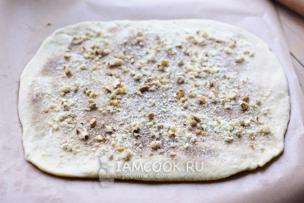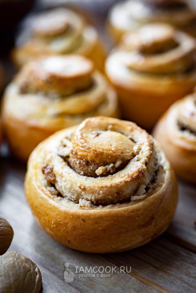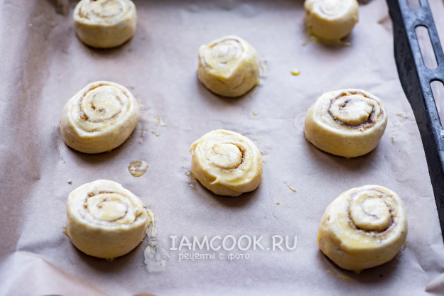 Все эти заготовки выложите на противень, застеленный пергаментом для выпекания. Каждую заготовку будущей булочки смажьте взболтанным яйцом. Выпекайте дрожжевые булочки с орехами и корицей 30 минут в уже заранее разогретой до 180 градусов духовке.