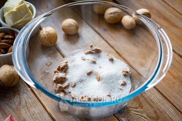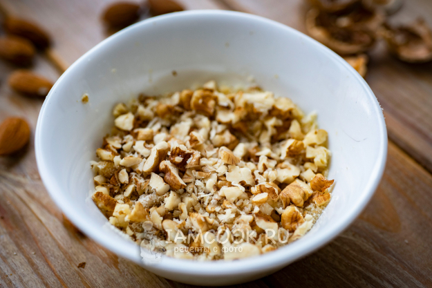 Грецкие орехи мелко нарежьте острым ножом. Так же поступите и с миндальными орехами. Миндальные орехи я измельчила в чоппере. Соедините оба вида измельченных орехов в миске и перемешайте.