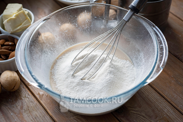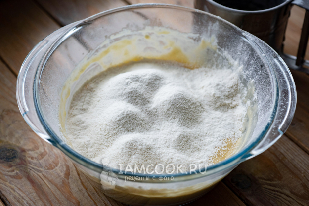 Затем просейте 4-5 столовых ложек муки.