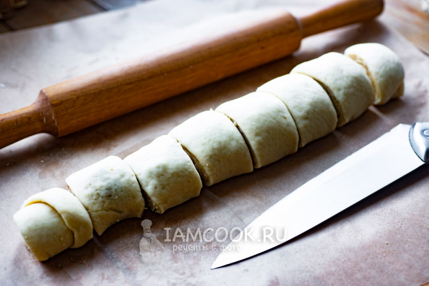 Скатайте из теста с ореховой начинкой рулетик и нарежьте на одинаковые части-заготовки. Все то же сделайте и с оставшейся частью теста.