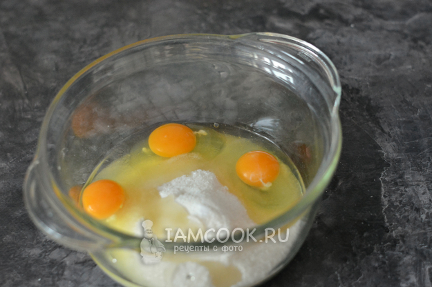В миску вбейте яйца, добавьте щепотку соли и сахар.