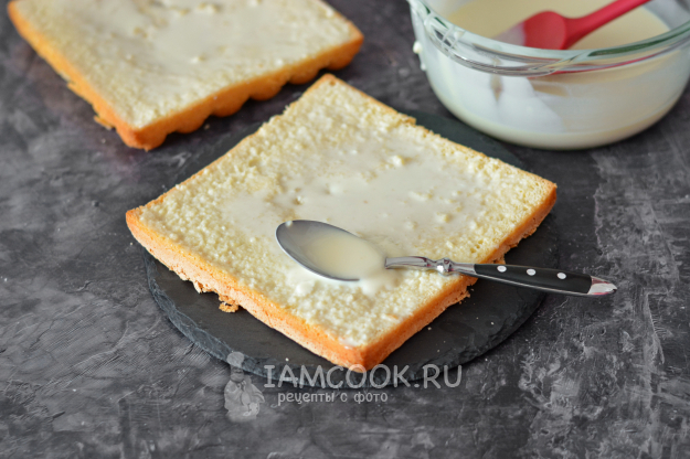 Оба коржа уложите срезом вверх и обильно смажьте пропиткой. Дайте им полежать около 15-20 минут в таком положении, чтобы всё впиталось.