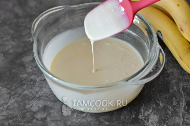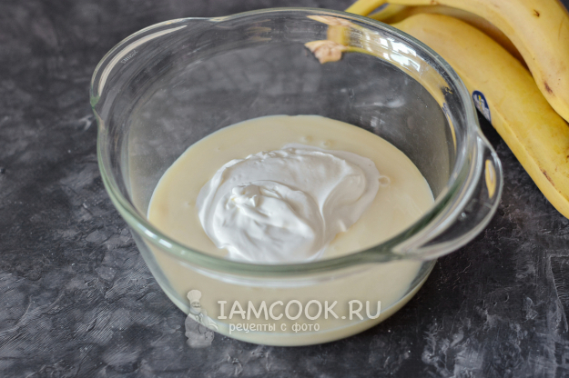 А тем временем подготовьте всё необходимое для пропитки нашего торта. Как такового крема (в привычном понимании) в этом торте нет. Он пропитывается смесью сгущёнки и сметаны и в прослойку кладутся бананы.