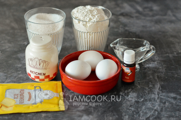 Первым делом испечём обычный бисквит. Продукты для его приготовления - на фото ниже.