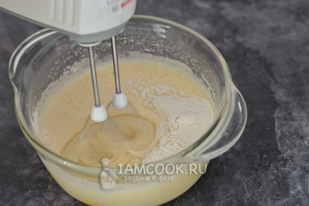 Теперь всыпьте муку и разрыхлитель и введите их в тесто на малой скорости миксера.