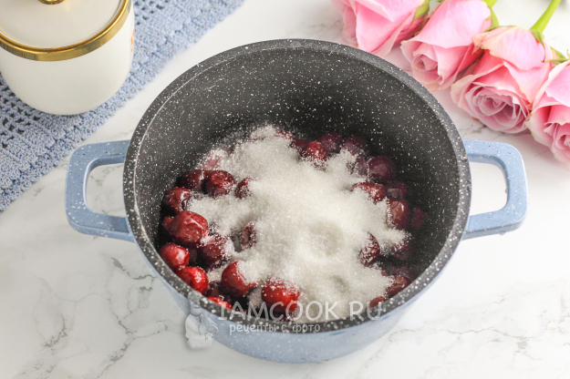 Если ягоды свежие, то промойте их в воде, а если замороженные, то не нужно. Всыпьте их в казан, ковш или кастрюлю с антипригарным дном. Добавьте туда же сахар.