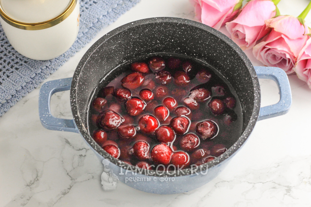 Выключите нагрев и процедите вишневый сироп через ситечко с мелкими ячейками. Вишню можно использовать для приготовления чая, морса или десертов.