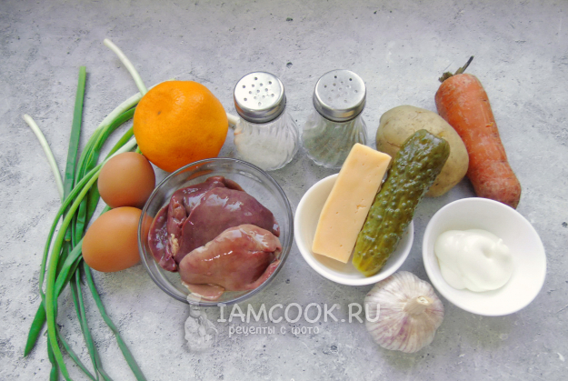 Соберите все ингредиенты для приготовления салата с печенью и мандаринами.