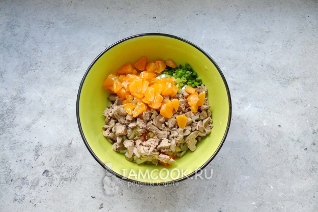 Каждую дольку мандарина разрежьте на три части, добавьте в салат. Отварную куриную печень нарежьте мелко.