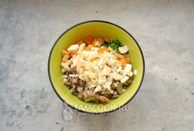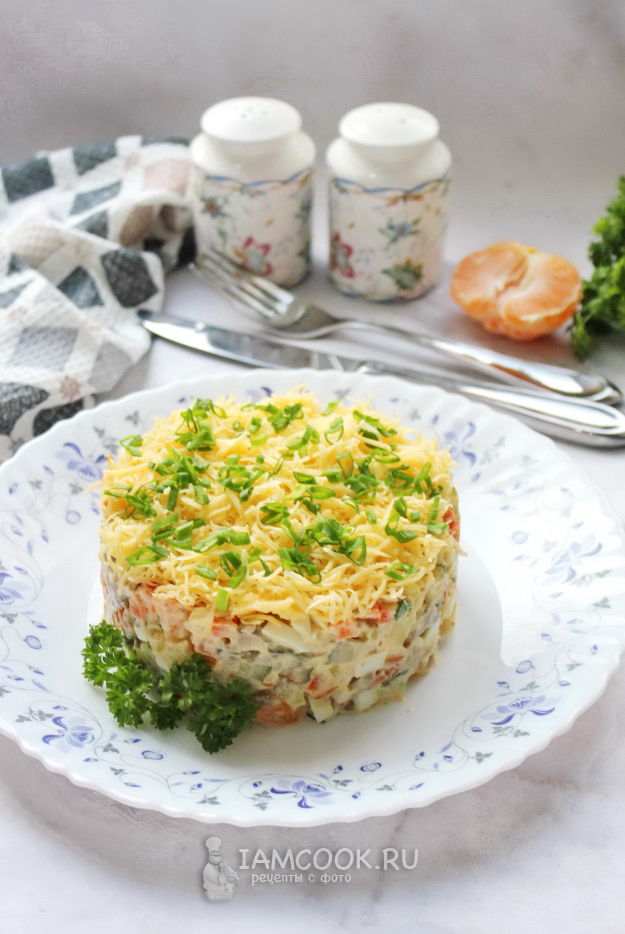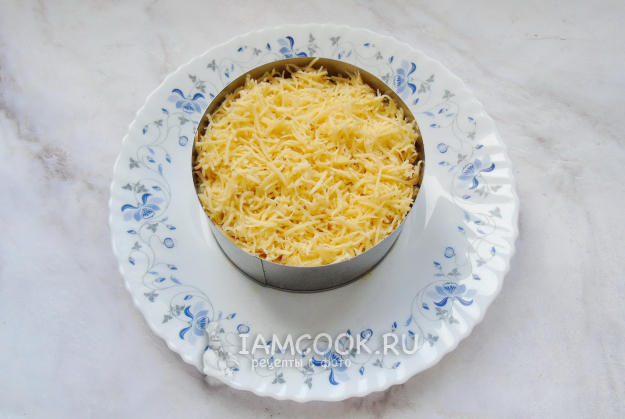 Выложите салат в специальное кольцо или просто на тарелку. Посыпьте тертым сыром.
