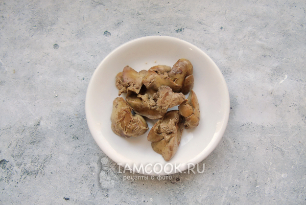 Куриную печенку очистите от прожилок, помойте и выложите в кастрюлю. Залейте водой, доведите до кипения. Затем огонь убавьте и варите до готовности, 7-8 минут. После достаньте из кастрюли и охладите.