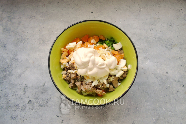 Заправьте салат майонезом, посолите и поперчите по вкусу.