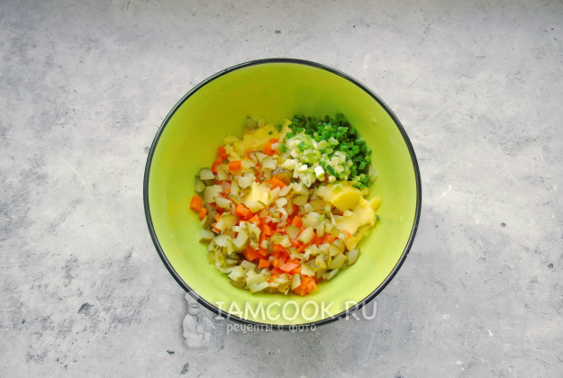 Картофель и морковь отварите, охладите и очистите. Затем нарежьте кубиками и выложите в салатник.