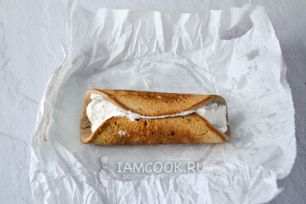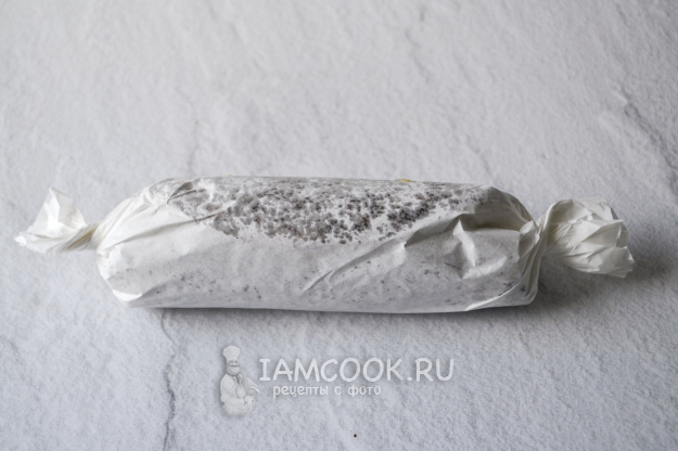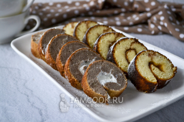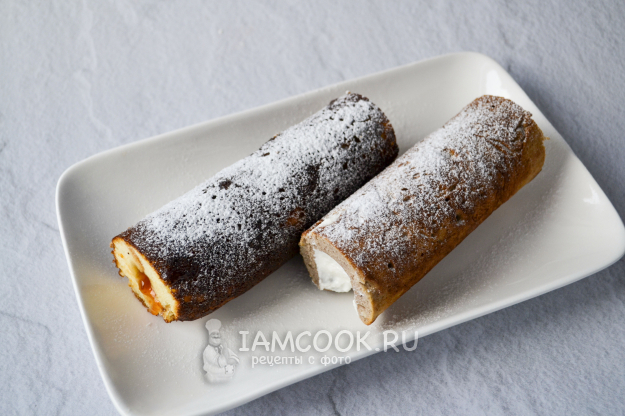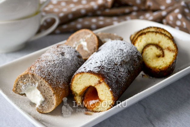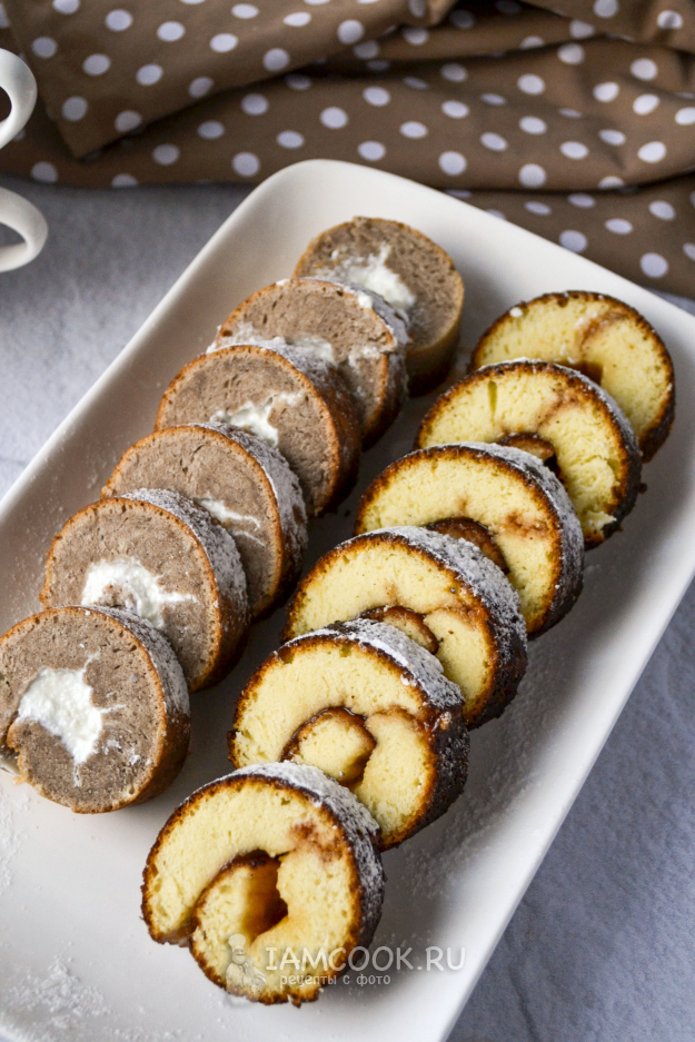 Сверните горячий бисквит в рулет и оставьте до полного остывания на кухонном столе. Таким же способом испеките второй шоколадный бисквит.