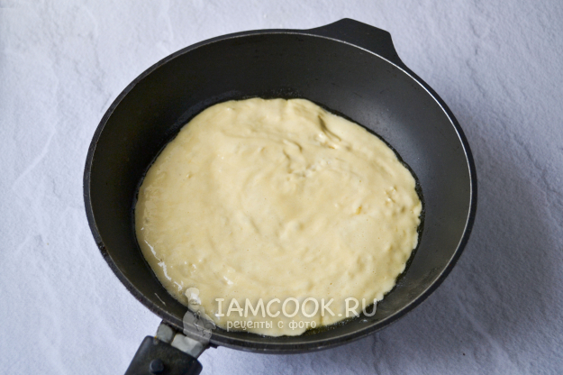 Растопите кусочек сливочного масла на сковороде и вылейте тесто. Разровняйте поверхность лопаткой.