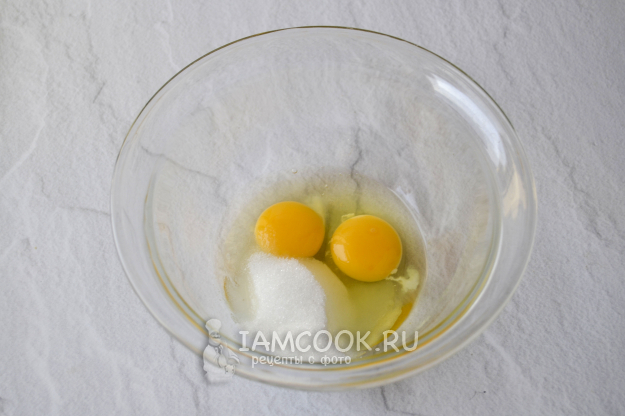 В глубокую миску разбейте яйца, добавьте обычный и ванильный сахар.