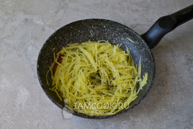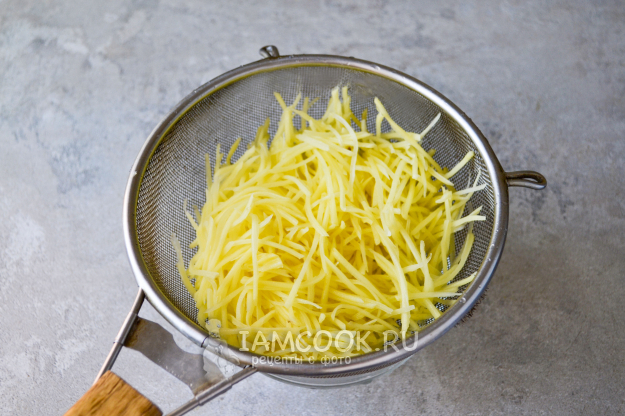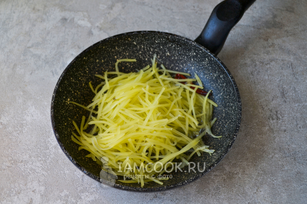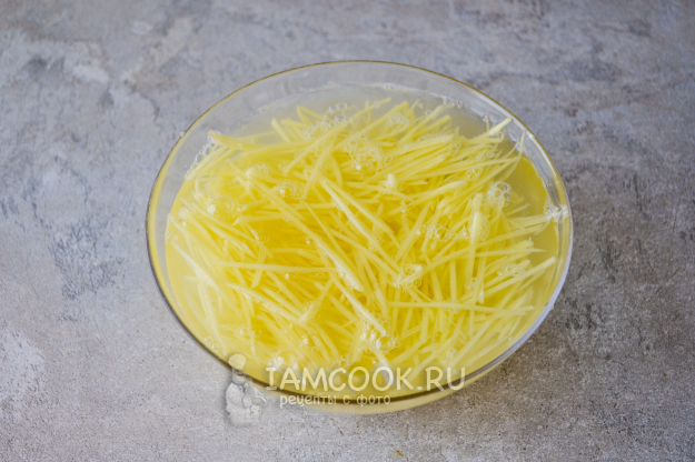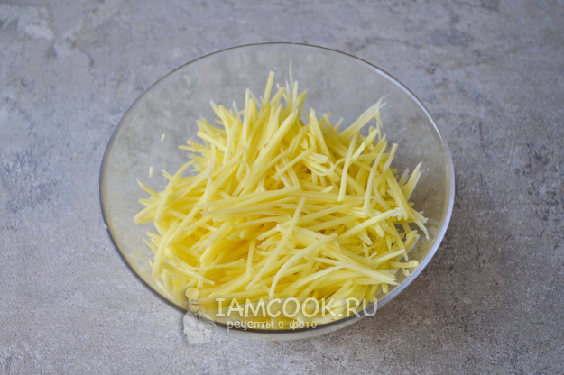 Натрите картошку на терке для корейских салатов или нарежьте от руки тонкой соломкой.