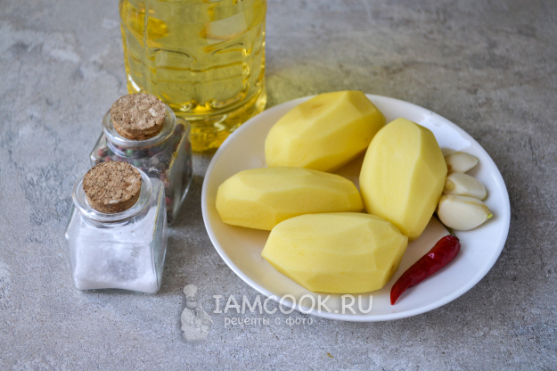 Соберите продукты для приготовления картошки по-китайски. Картофель вымойте и очистите. Чеснок очистите.