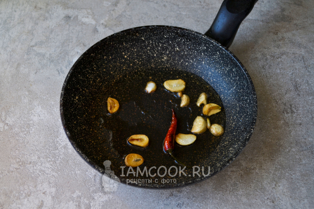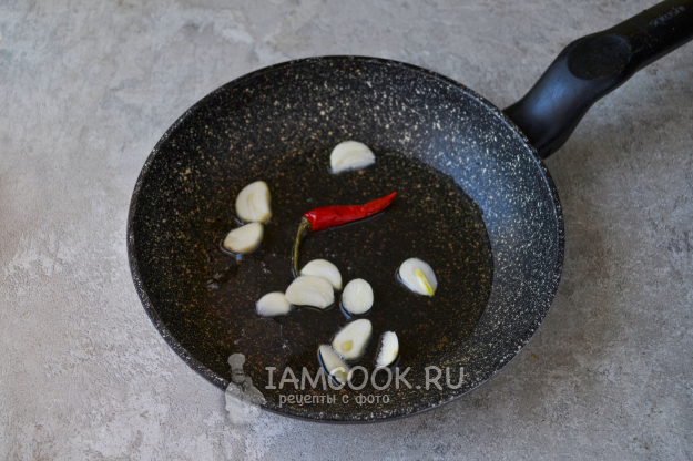 Разогрейте в сковороде растительное масло. Положите нарезанный дольками чеснок и острый перчик.