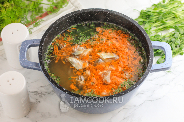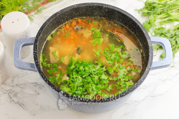 Туда же выложите измельченную зелень петрушки и отварите все еще 3-4 минуты. Попробуйте суп из копченой рыбы на вкус и подкорректируйте его при необходимости.