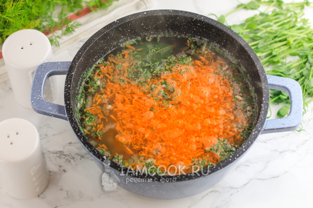 Натрите морковь на терке с мелкими ячейками и всыпьте в емкость вместе с приправой и солью. Отварите еще 2-3 минуты.