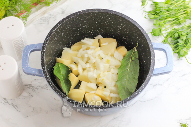 Очистите от кожуры лук, морковь и картофель. Промойте овощи в воде и нарежьте картофель средними кубиками, а лук - мелкими. Всыпьте в кастрюлю или казан и добавьте лавровые листья. Влейте горячую воду и отварите в течение 12-15 минут.