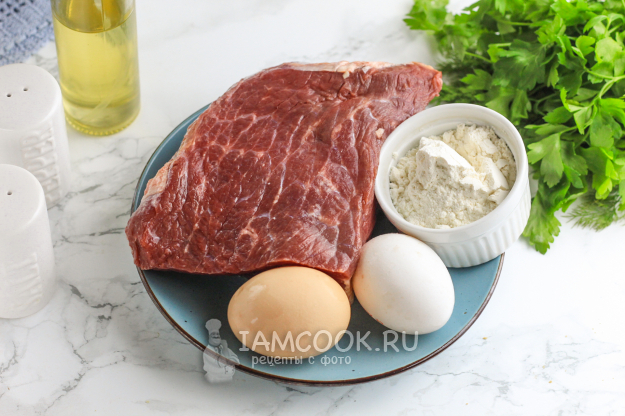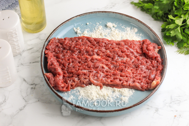 Высыпьте на тарелку пшеничную муку высшего сорта и обваляйте в ней отбитое мясо со всех сторон.