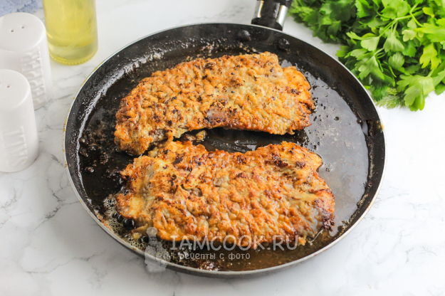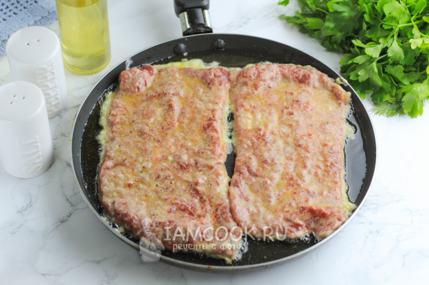 Прогрейте на сковороде растительное масло и только тогда выложите в него заготовки отбивных. Если выложить их в холодное масло, то кляр отстанет от мяса и подгорит. Убавьте нагрев до среднего и обжарьте отбивные примерно 2-3 минуты с одной стороны.