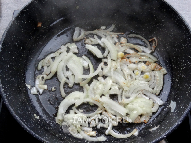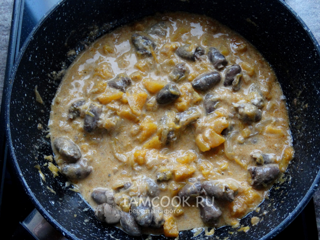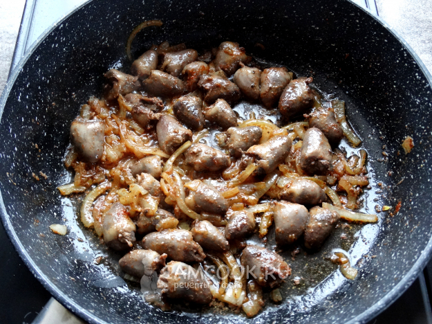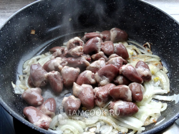 Добавить к луку сердечки, жарить, помешивая, пару минут.