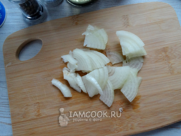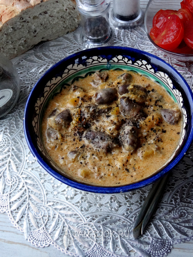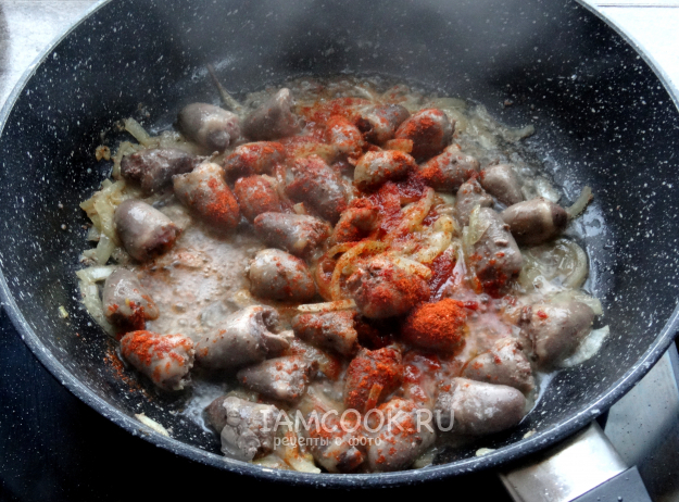 Сердечки с луком присыпать паприкой, посолить и поперчить по вкусу.