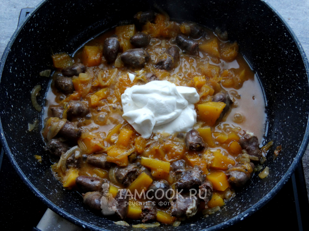 Добавить в сковороду тыкву и воду, чтобы она слегка покрывала содержимое сковороды.
