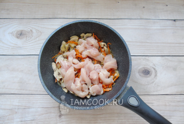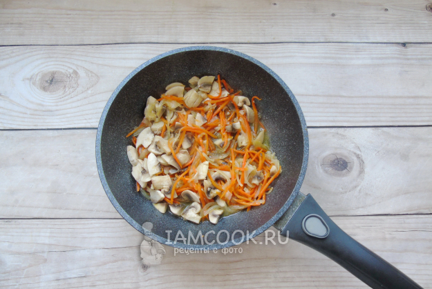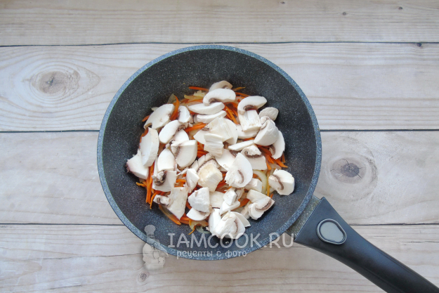 Шампиньоны очистите, помойте и нарежьте произвольно, но не очень мелко. Добавьте к луку и моркови.