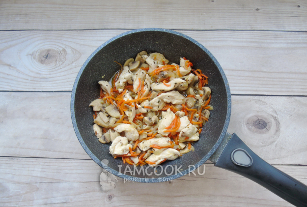 Накройте сковороду крышкой и тушите курицу с овощами и грибами 7-8 минут на небольшом огне, периодически перемешивая.