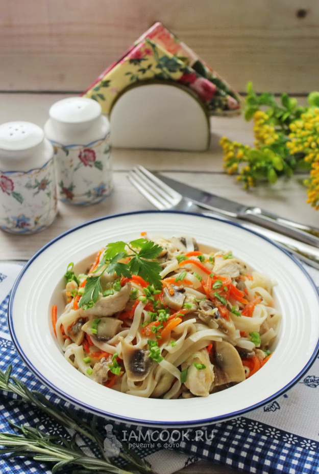 Лапша удон с курицей и грибами готова. Подавайте со свежими овощами и соленьями.