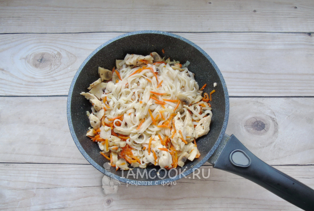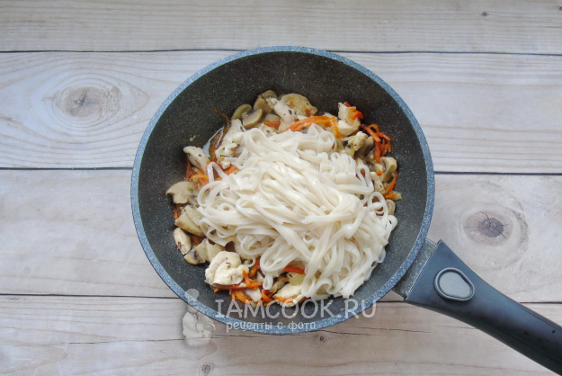 А тем временем вскипятите в кастрюле воду, посолите её и выложите удон. С момента закипания варите лапшу 4-5 минут. Затем откиньте на дуршлаг и добавьте в сковороду с курицей, овощами и грибами.