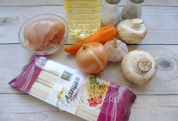 Соберите ингредиенты для приготовления лапши удон с курицей и грибами.