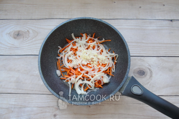 Морковь, чеснок и репчатый лук нарежьте произвольно. Я лук нарезала полукольцами, чеснок - мелко, а морковь натёрла на терке для корейской моркови. Выложите в сковороду и налейте подсолнечное масло.