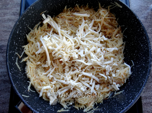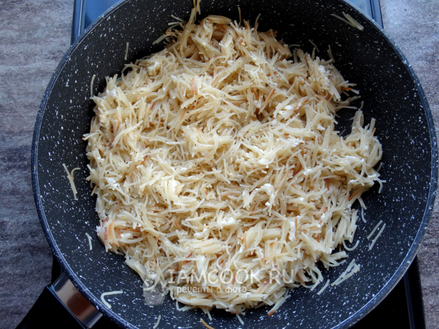 Когда вода испарится, лапша готова. Добавить плавленый сыр и быстро перемешать вермишель с сыром на сковороде.