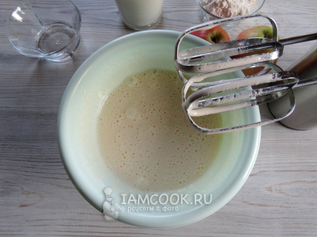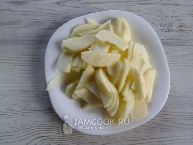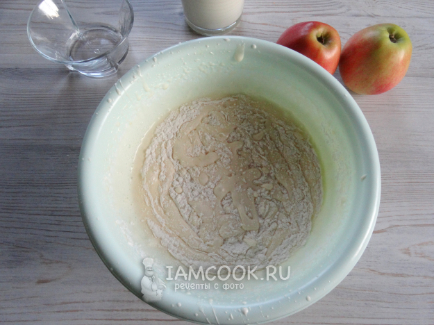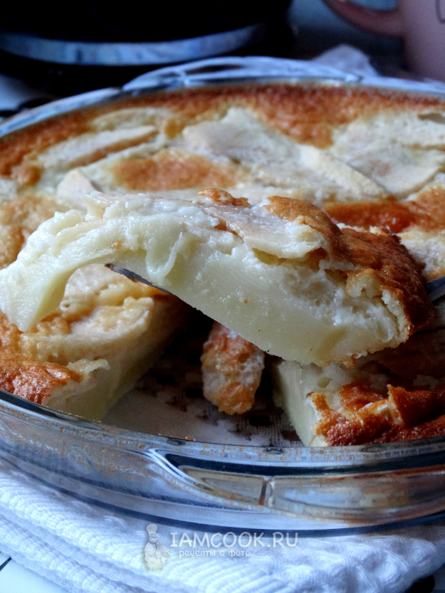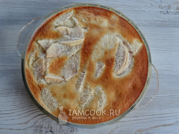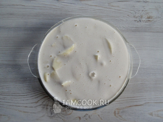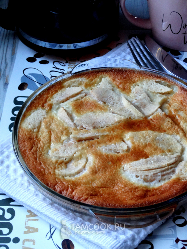В смазанную маслом форму (22-23 см) выложить яблоки, сверху залить тестом.