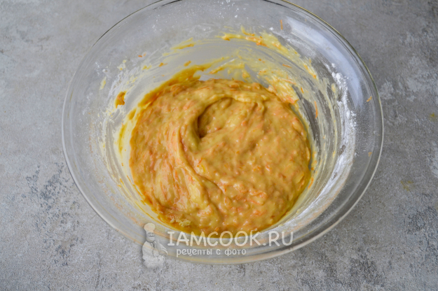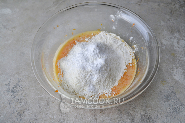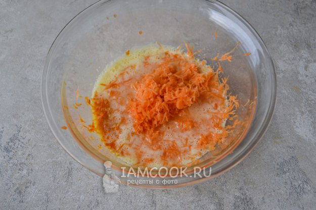 Морковь натрите на мелкой терке. Отожмите руками сок из моркови и положите ее в миску. Снимите цедру с апельсина, добавьте в миску. Перемешайте.