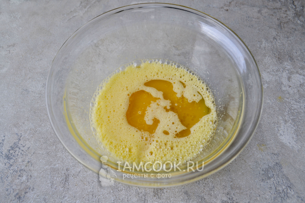 Миксером взбейте яйца с сахаром и влейте растительное масло. Выжмите сок из половины апельсина и добавьте его в миску.